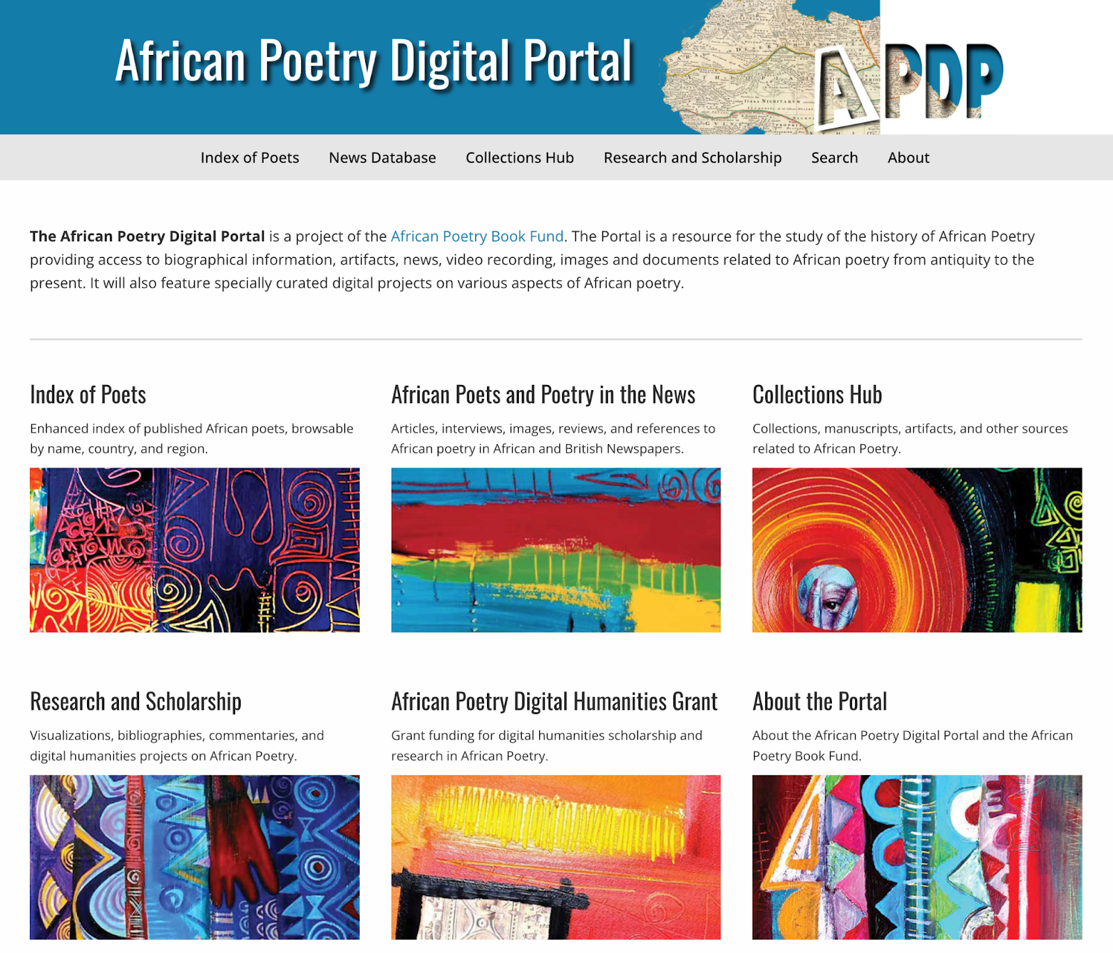 The African Poetry Digital Portal, a project of the African Poetry Book Fund, is a long running project providing invaluable resources for the study of the history of African Poetry. This WordPress/Omeka mashup provides access to biographical information, artifacts, news, video recording, images and documents related to African poetry from antiquity to the present.